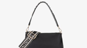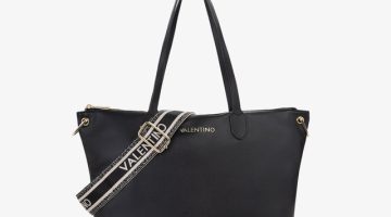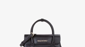 Stylische Handtasche aus Lederimitat mit goldenem Valentino-Logo, zwei Tragehenkeln und verstellbarem Schultergurt. Das Hauptfach wird mit Reißverschluss geschlossen. Die beiden Henkel lassen sich durch eine Druckknopf-Lasche verbinden. Vier kleine goldene Standfüßchen sorgen für Schutz und Stabilität beim Abstellen.