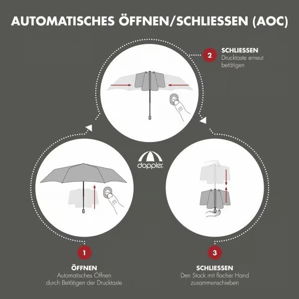 Er ist mit seinem geringen Packmaß blitzschnell in jeder Tasche verstaut und damit bei schlechtem Wetter sofort griffbereit. Auf Knopfdruck öffnet und schließt er sein Schirmdach und bietet trotz der kompakten Abmessungen zuverlässig Schutz vor Regen.